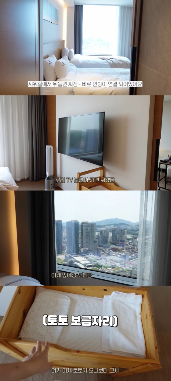 또한 침대가 두개 있는 걸 발견하고 "드디어 (남편이) 소파가 아니라 침대에 누울 수 있게 됐다"라고 감탄했다. 그의 남편 역시 "이제 허리가 안 아플 거 같다"라고 토로했다. 조식권을 발견한 헤이지니는 "여기가 거의 남편의 조캉스라고 불리는 곳이다. 아침마다 남편이 호텔 조식을 먹을 수 있다더라"고 전했다.
