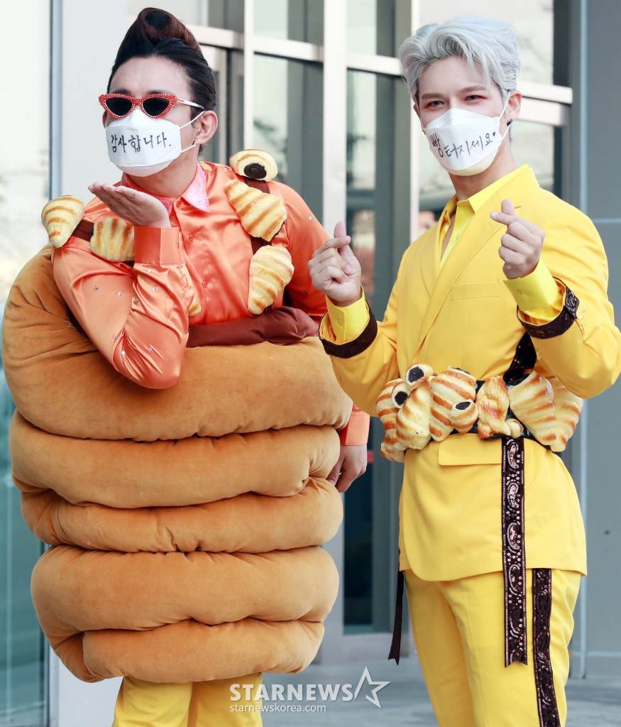 그룹 노라조 조빈과 원흠이 5일 오후 서울 마포구 MBC본사에서 열리는 '쇼 음악중심' 일정 차 도착하고 있다. /사진=임성균 기자 tjdrbs23@