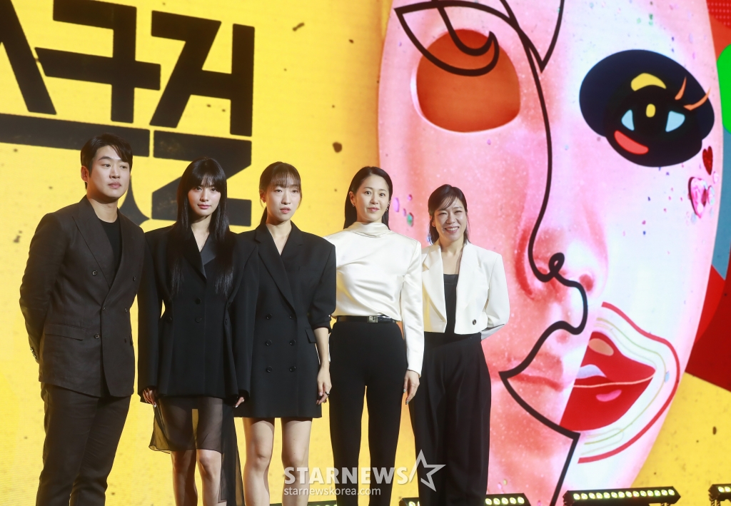 배우 안재홍, 나나, 이한별, 고현정, 염혜란이 16일 오전 서울 JW 메리어트 동대문 스퀘어에서 진행된 넷플릭스 오리지널 시리즈 '마스크걸' 제작발표회에 참석해 포즈를 취하고 있다.