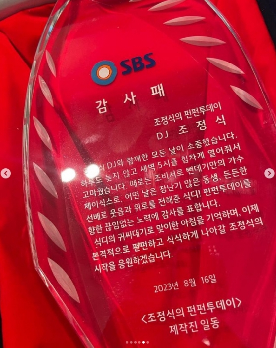 그가 공개한 사진과 영상에는 조정식이 SBS 라디오센터에서 감사패를 받고 인사하는 모습이 담겨 있었다. 조정식은 오는 20일까지 7년간 매일 오전 5시부터 7시까지 SBS 파워FM '조정식의 펀펀투데이' DJ를 맡아 방송을 이끄는 것.
