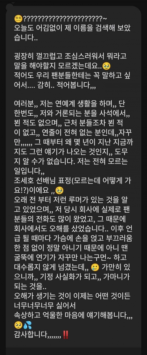 결국 제인은 직접 입을 열었다. 그는 지난 18일 팬 커뮤니티에 "오늘도 어김없이 내 이름을 검색해 봤다. 굉장히 껄끄럽고 조심스러워서 뭐라고 말을 해야 할지 모르겠다"면서 "나는 연예계 생활을 하며 단 한 번도 나와 거론되는 분을 사석에서 뵌 적도 없으며 근처 분들조차 뵌 적이 없고 연줄이 전혀 없는 분인데 몇 년이 지난 지금까지도 그런 얘기가 나오는 것인지 도무지 알 수가 없다"고 밝혔다.