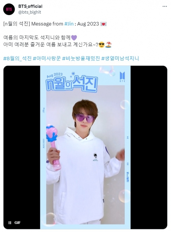 8월 20일 방탄소년단 공식 트위터 계정에는 [n월의 석진] Message from #Jin : Aug 2023 "여름의 마지막도 석지니와 함께♥ 아미 여러분 즐거운 여름 보내고 계신가요~?" 라는 문구와 함께 진이 귀엽게 춤추는 사진이 공개됐다. 팬사랑꾼 진이 입대 전 준비해 다달이 공개하는 'n월의 석진'이 8월에는 움직이는 사진인 것.