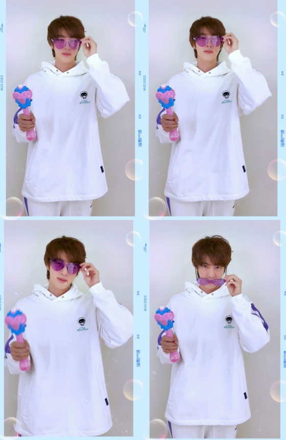 진이 만든 캐릭터 '우떠' 굿즈 옷을 입은 채 보라색 하트 모양의 장난감 선글라스를 쓰고 손에 핑크색 비눗방울 요술봉을 든 진은 비눗방울의 움직임을 표현, 리듬을 타며 두둥실 춤을 추는 깜찍한 모습으로 전 세계 팬들을 열광하게 만들었다.