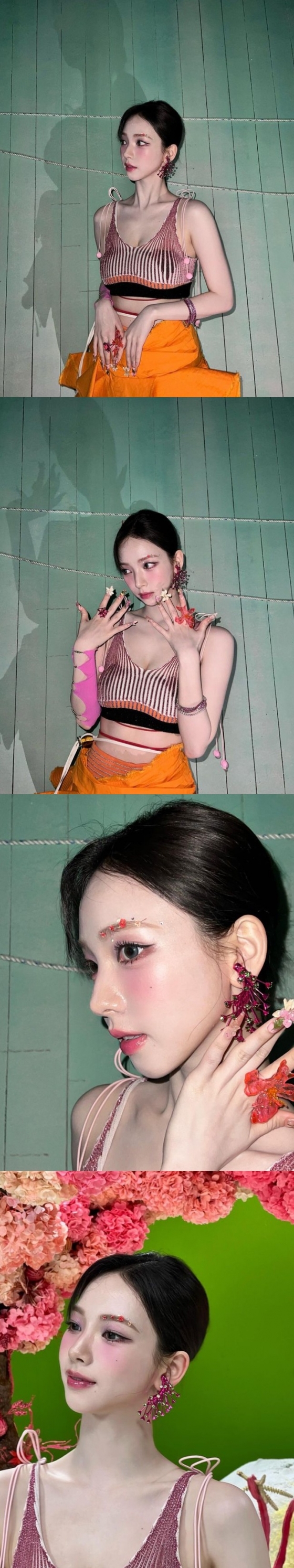 공개된 사진 속 카리나는 꽃으로 포인트를 준 화려한 메이크업을 하고 다양한 포즈를 취하고 있다. 특히 브라 톱 모양의 의상을 입고 볼륨감 넘치는 몸매를 드러내 시선을 사로잡았다. 또 초근접샷에도 빛나는 무결점 피부와 작은 얼굴에 꽉 찬 이목구비는 보는 이들을 감탄케 했다.