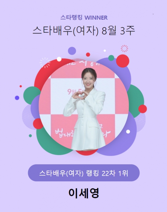 지난 17일 오후 3시 1분부터 24일 오후 3시까지 진행된 8월 3주(22차) 스타랭킹 스타배우 여자 랭킹 투표에서 이세영이 18주 연속 1위를 수성했다.