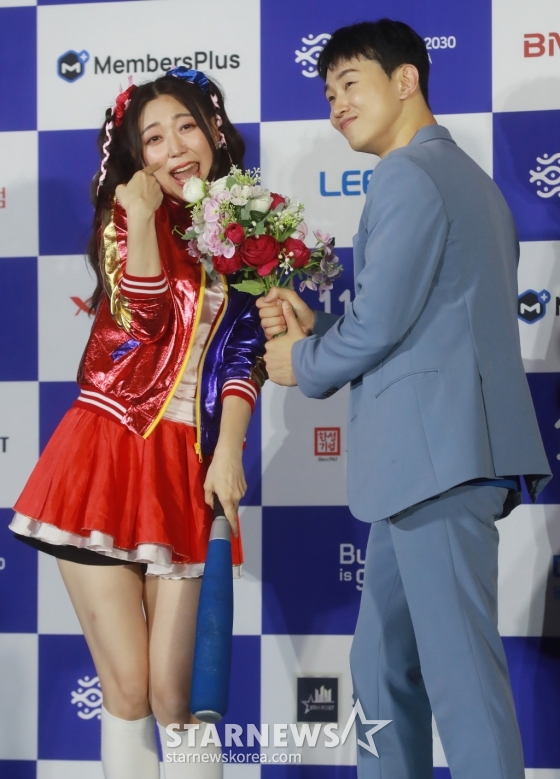 코미디언 리리코, 송재인이 25일 오후 부산 영화의 전당에서 진행된 제11회 부산국제코미디페스티벌(BICF) 블루카펫 행사에 참석해 포즈를 취하고 있다.