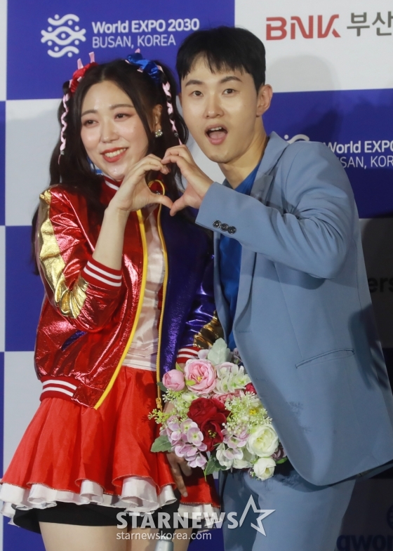 코미디언 리리코, 송재인이 25일 오후 부산 영화의 전당에서 진행된 제11회 부산국제코미디페스티벌(BICF) 블루카펫 행사에 참석해 포즈를 취하고 있다.