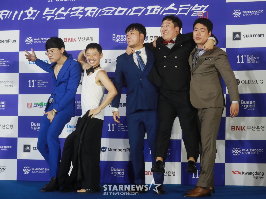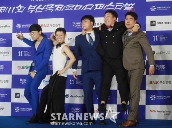 유튜버 차청일, 이명재, 김동현, 이현석, 강민석이 25일 오후 부산 영화의 전당에서 진행된 제11회 부산국제코미디페스티벌(BICF) 블루카펫 행사에 참석해 포즈를 취하고 있다.
