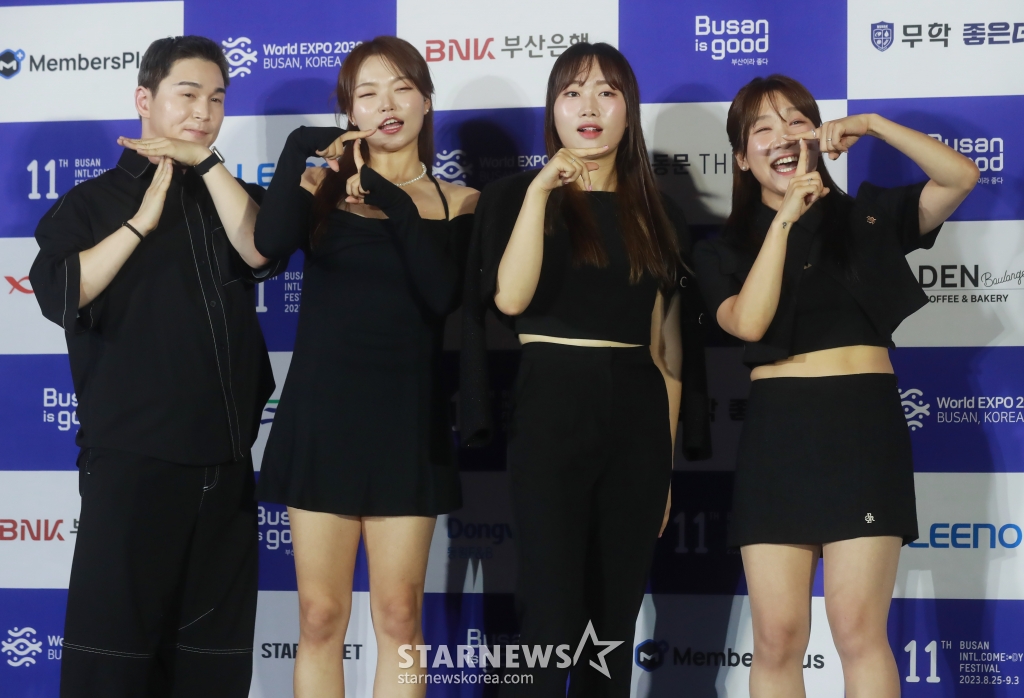 코미디언 송치호, 한지원, 허미진, 김지유가 25일 오후 부산 영화의 전당에서 진행된 제11회 부산국제코미디페스티벌(BICF) 블루카펫 행사에 참석해 포즈를 취하고 있다.