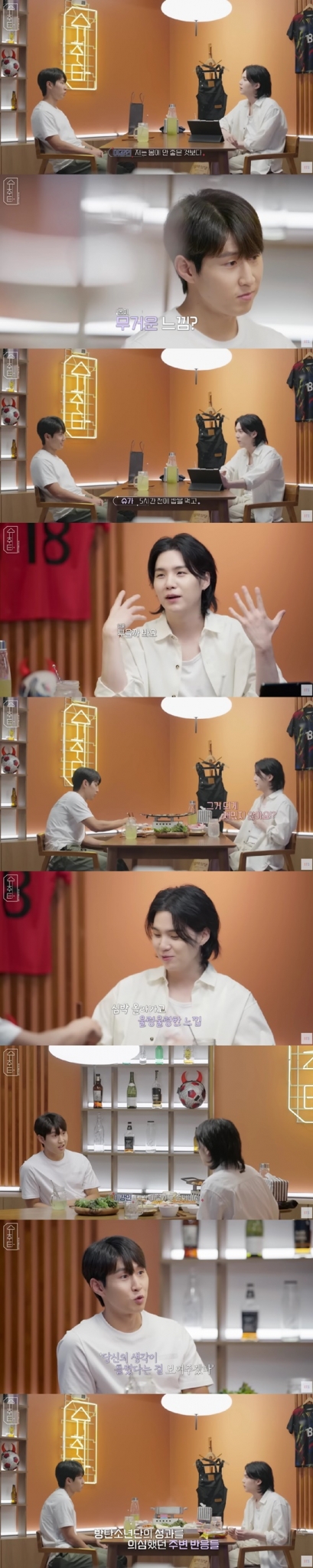 그러자 슈가는 "저도 무대에 올라가기 5시간 전에는 밥을 먹고, 공연 끝나고는 다음 날 몸이 부을까봐 샐러드를 먹는다. 가수들은 3일 연속으로 공연을 하기 때문에 샐러드를 먹는다"고 공감했다.