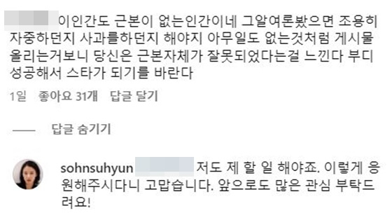 특히 한 누리꾼은 손수현에게 "이 인간도 근본이 없는 인간이네. '그알' 여론 봤으면 조용히 자중하던지 사과를 하든지 해야지. 아무런 일도 없는 것처럼 게시물 올리는 거 보니 당신은 근본 자체가 잘못됐단 걸 느낀다. 부디 성공해서 스타가 되기를 바란다"고 댓글을 남겼다.