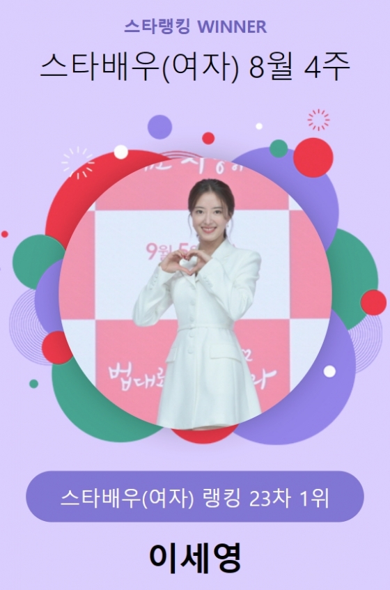 이세영은 지난 24일 오후 3시 1분부터 31일 오후 3시까지 진행된 8월 4주(23차) 스타랭킹 스타배우 여자 랭킹 투표에서 박은빈, 윤아를 꺾고 1위를 차지했다.