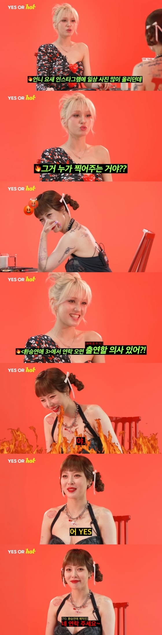 전소미는 "하나 더 물어봐? 일단 사랑하는데 언니 만약에 '환승연애3'에서 연락 오면 출연할 의사가 있어?"라는 질문을 던졌다. 현아는 당황한 듯 고개를 숙이며 "야"라고 했지만 이내 "어 YES"라며 '환승연애3' 제작진을 향해 "연락주세요"라고 말했다. 전소미는 "대단한 여성이다"라며 현아를 향해 엄지를 치켜세웠고, 현아는 "와 진짜 세다"라며 전소미의 질문 세기에 혀를 내둘렀다.
