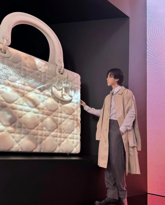 디올의 글로벌 앰버서더인 지민은 여러장의 사진에서 2023 윈터 컬렉션 중 화이트 셔츠와 그레이 팬츠, 베이지 롱 레더 코트를 착용했으며 작은 얼굴에 타고난 황금 비율의 바디 프로모션으로 시선을 모은다.