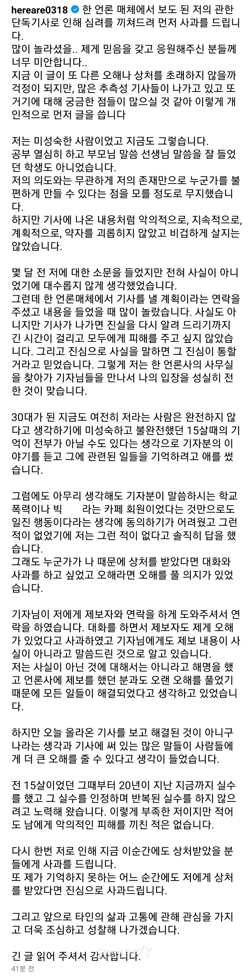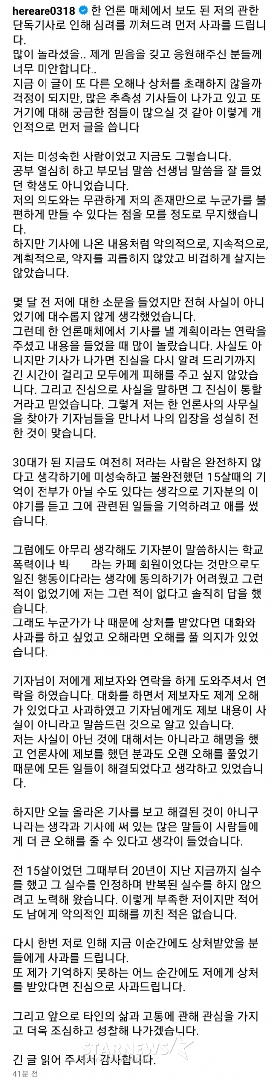 이어 "몇 달 전, 나와 관련된 소문을 들었지만, 전혀 사실이 아니라 대수롭지 않게 생각했다. 그런데 한 언론 매체에서 기사 낼 계획이라는 연락을 줬고 내용을 들었을 때 많이 놀랐다. 사실도 아니지만, 기사가 나가면 진실을 다시 알려 드리기까지 긴 시간이 걸리고 모두에게 피해를 주고 싶지 않았다. 그리고 진심을 말하면 그 진심이 통할 거라 믿었다. 그렇게 난 한 언론사의 사무실을 찾아가 기자님들을 만나고 내 입장을 전한 게 맞다"라며 "아무리 생각해도 기자 분이 말하는 학교 폭력이나 빅XX란 카페 회원이었다는 것만으로도 '일진 행동이다'란 생각에 동의하기가 어려웠고 그런 적이 없어서 난 '그런 적 없다'고 솔직히 답했다. 그래도 누군가가 나 때문에 상처받았다면 대화와 사과를 하고 싶었고 오해라면 오해를 풀 의지가 있었다"라고 속내를 털어놨다.