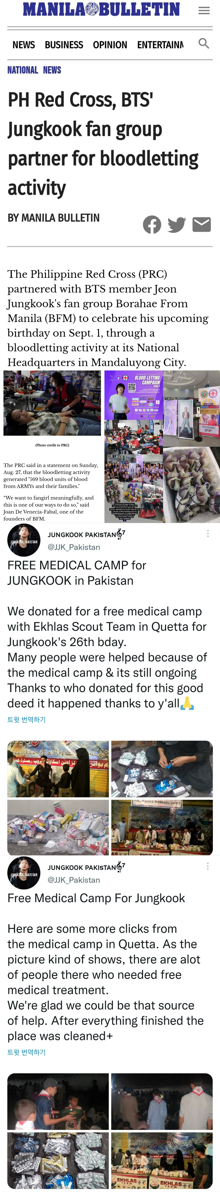 최근 필리핀 유력 일간지 '마닐라 불레틴'(Manila Bulletin)은 필리핀 적십자사(PRC)가 9월 1일 정국의 생일을 맞아 현지 팬 단체 'BFM'(보라해 프롬 마닐라)과 파트너십을 맺어 만달루용(Mandaluyong) 국가 본부에서 헌혈 활동을 추진했다고 보도했다.