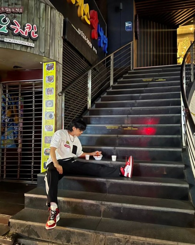 가수 임영웅이 건물 계단에 앉아 떡볶이를 먹고 있는 모습이 담긴 사진을 공개했다.