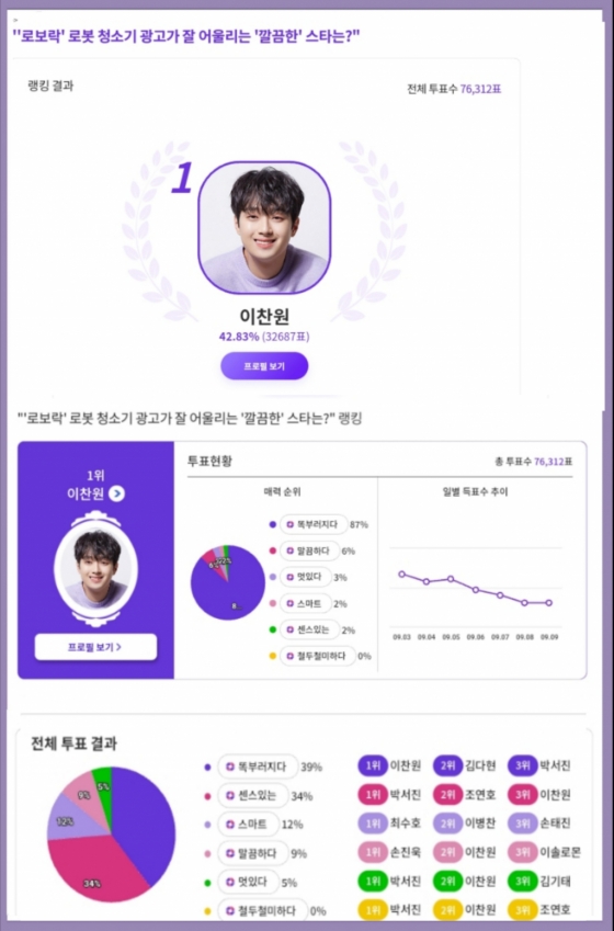 이찬원은 9월 3일부터 9월 9일까지 익사이팅 디시에서 진행된 '로보락 로봇 청소기 광고가 어울리는 깔끔한 스타는?' 설문에서 1위를 차지했다.