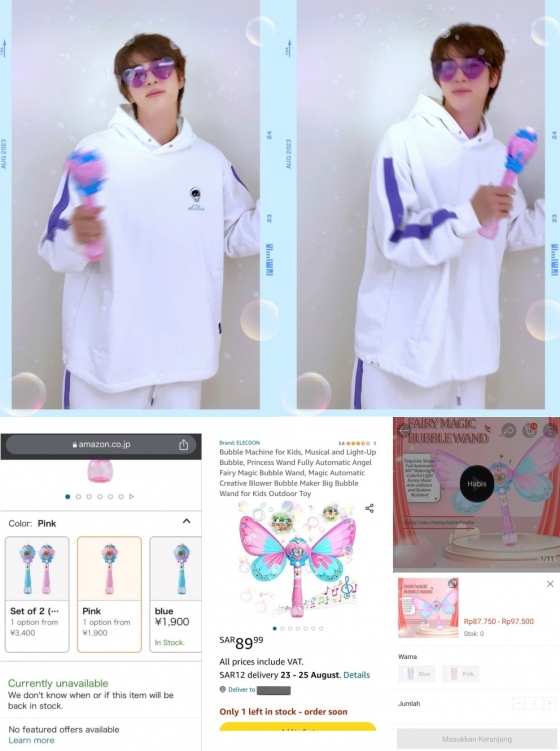 팬사랑꾼 진이 입대 전 준비해 공개하는 'n월의 석진' 중 최근 8월 20일 공개한 콘텐츠에서 손에 들고 있던 비눗방울 요술봉은 아마존 재팬에서 진이 사용한 핑크 요술봉이 1시간도 안돼 품절되고, 아마존 사우디 아라비아에서는 재고 1개를 남기고 모두 품절됐으며 인도네시아 샵에서는 모든 색상의 요술봉이 품절됐다.