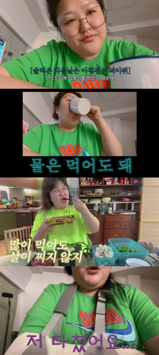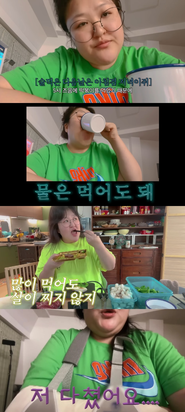 이국주는 "살을 좀 급하게 빼야 할 것 같다"면서 몸무게 뒷자리를 공개했다. 그는 "5시 즈음에 떡볶이를 먹었기 때문에 더 이상은 먹으면 안 된다. 공복을 16시간 정도 유지하는 게 좋다고 한다"고 밝혔다.