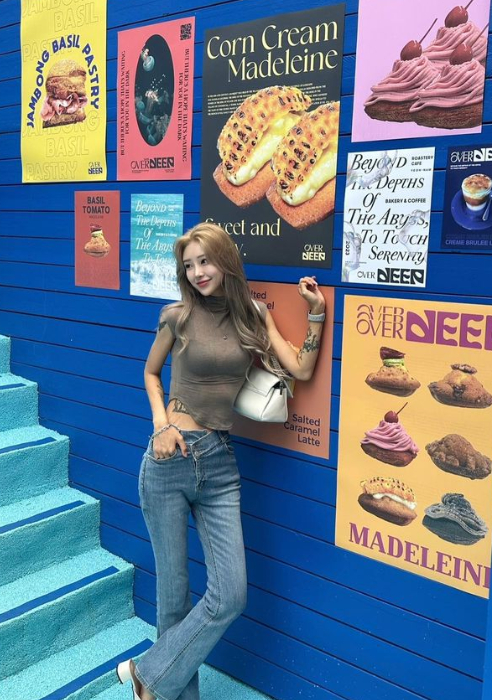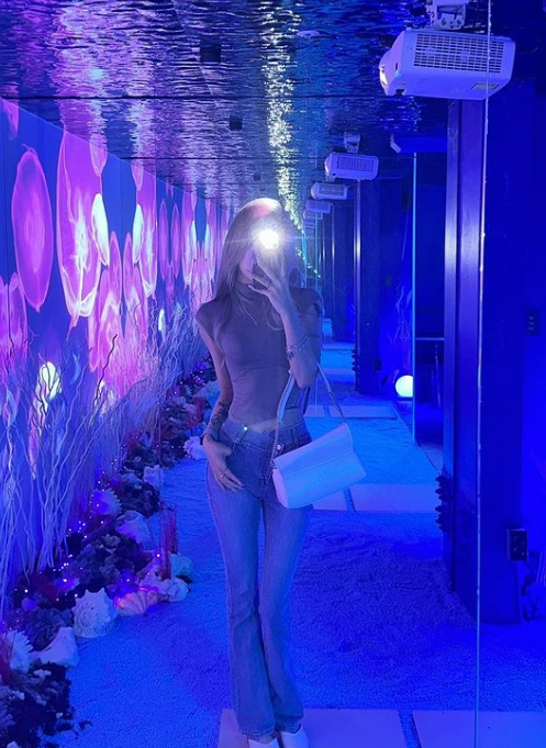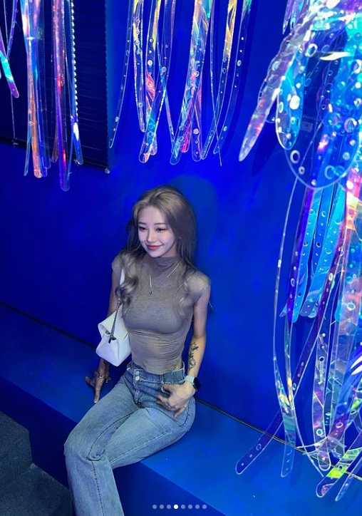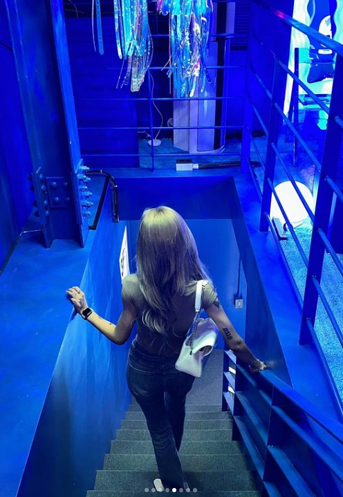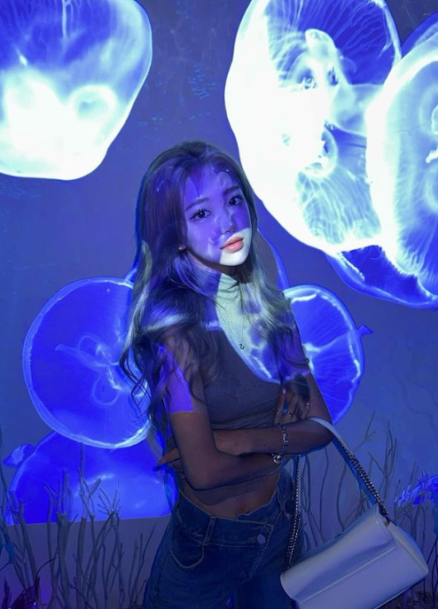공개된 사진에서 최준희는 푸른 빛깔이 독특한 카페 내부를 배경으로 민소매 폴라 셔츠와 부츠컷 진을 매치하고 포즈를 취하고 있다.
