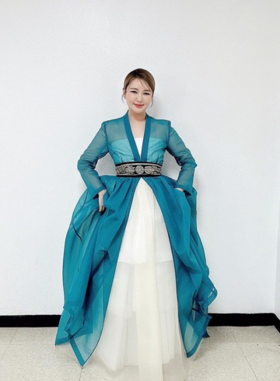공개된 사진 속 송가인은 줄타기 명인 권원태와 나란히 서 함박미소를 머금고 카메라를 응시하고 있다. 특히 청록색 한복을 입은 그의 모습은 마치 선녀를 연상케 해 팬들의 마음을 설레게 했다.
