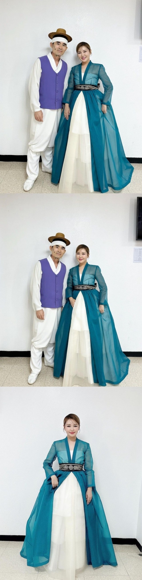가수 송가인이 남사당 줄꾼 권원태와 촬영한 기념사진을 공개했다.