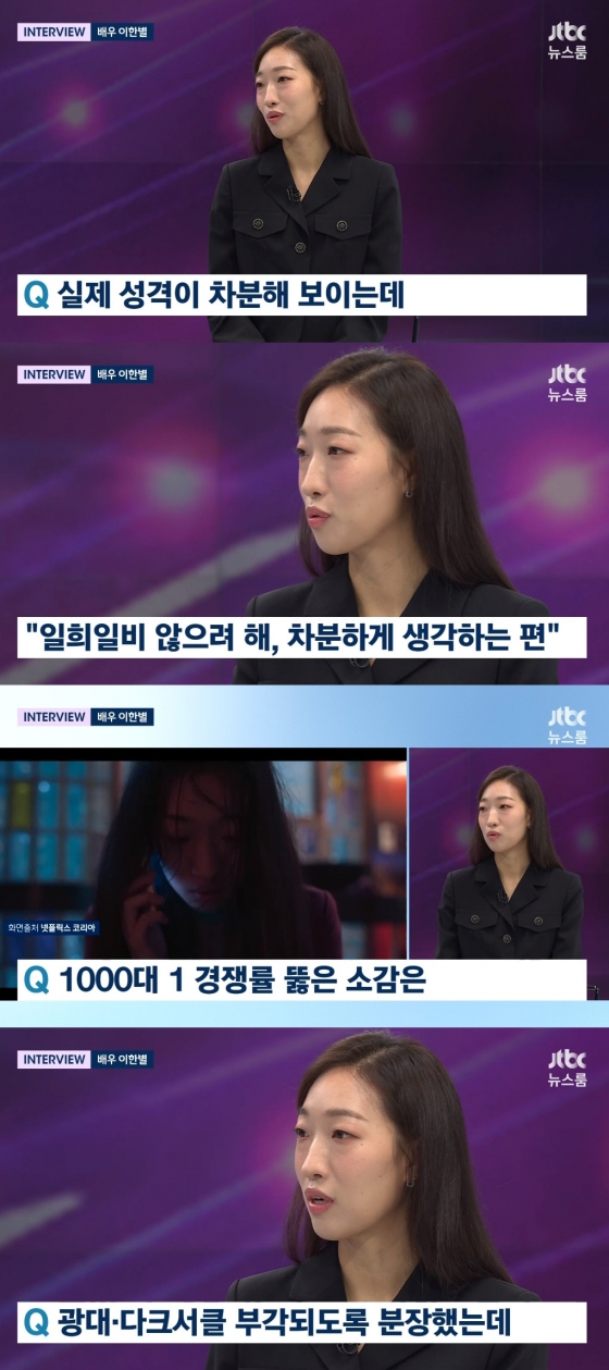 16일 방송된 JTBC '뉴스룸'에는 넷플릭스 시리즈 '마스크걸'의 주연 배우 이한별이 출연해 다양한 이야기를 나눴다.