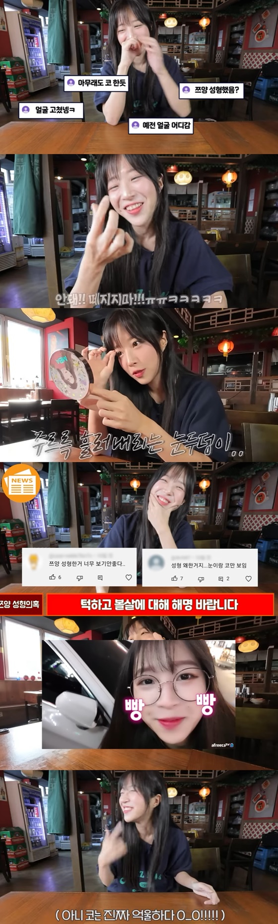 또한 쯔양은 성형을 해명하는 시간을 가졌다. 그는 "쌍꺼풀 얘기가 많이 나오는데 한쪽은 진하고 한쪽은 옅어서 (옅은 쪽에 쌍꺼풀) 테이프를 붙인 거다"라고 설명했다. 이후 한쪽 눈에 붙은 쌍꺼풀 테이프를 떼어내며 성형 의혹을 부인했다.