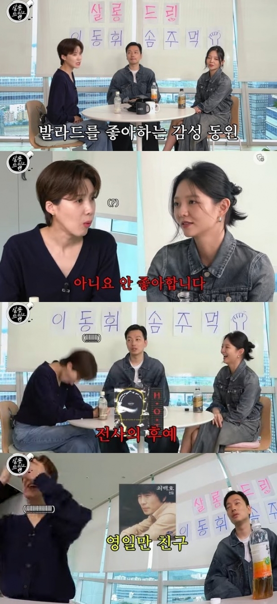 이동휘는 '천박사 퇴마 연구소' 출연자들과 함께한 회식자리 일화를 전했다. 그는 이솜이 노래방에서 '전사의 후예', '영일만 친구' 등 강렬한 노래만 불렀다고 전해 모두를 놀라게 했다. 그러면서 그 자리에 함께 있던 강동원은 이솜의 선곡 분위기와 대비되는 부드러운 선율의 발라드를 불렀다고 밝혀 관심을 모았다.