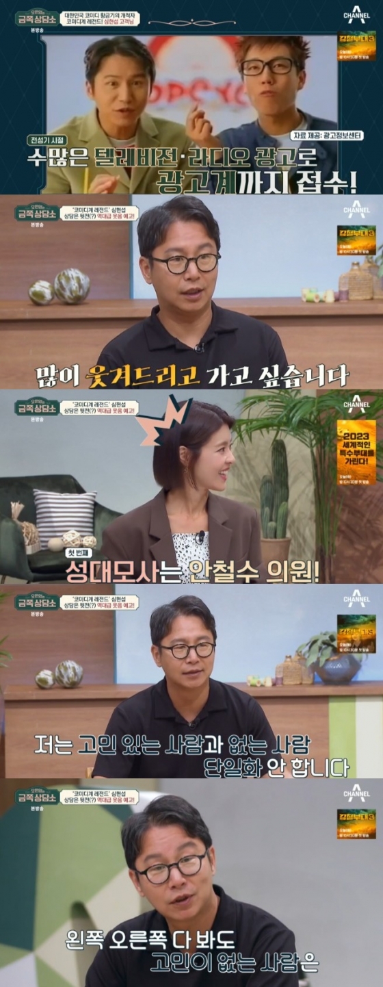 그러자 심현섭은 곧바로 안철수 의원과 현직 대통령을 성대모사해 모두를 폭소케 했다. 특히 그는 현직 대통령의 성대모사 중 "왼쪽 오른 쪽 다 봐도, 도리도리, 고민이 없는 사람은 'American Pie'"라며 모창까지 선보여 시선을 모았다.