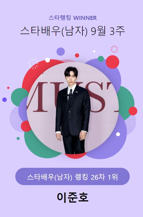 이준호는 지난 14일 오후 3시 1분부터 21일 오후 3시까지 진행된 9월 3주(26차) 스타랭킹 스타배우 남자 랭킹 투표에서 2만 3645표를 획득하며 1위를 차지했다.