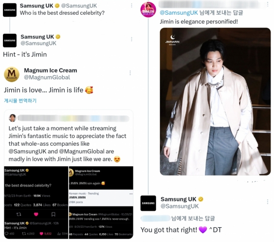 또 다른 네티즌은 ''잠시 시간을 내어 지민의 환상적인 음악을 스트리밍하면서 삼성 모바일 UK와 매그넘 같은 큰 유명 회사들이 우리처럼 지민을 미친 듯이 사랑하고 있다는 사실을 감상해 보자''라며 그들이 지민이게 보인 애정어린 게시글을 함께 업로드했다.