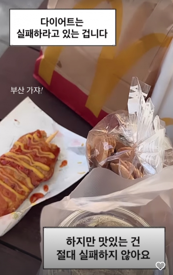 사진에는 맥도날드 포장 봉지와 과자, 튀김 꼬치 등이 담겨 있었다.