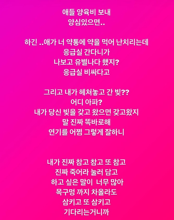 지연아는 25일 "애들 양육비 보내 양심있으면.. 하긴.. 애가 너 약통에 약을 먹어 난리치는데 응급실 간다니까 나보고 유별나다 했지? 응급실 비싸다고. 그리고 내가 해놓고 간 빚? 어디 아파? 내가 당신 빚을 갖고 왔으면 갖고왔지. 말 진짜 똑바로 해. 연기를 어쩜 그렇게 잘하니"라고 글을 올렸다.