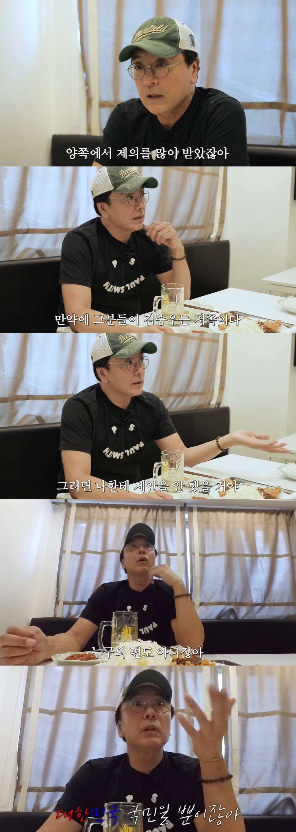 또한 "정치하려고 하는 거 아니냐는 오해를 많이 받았을 거 같은데"란 질문에, 김승우는 "난 예전에 양쪽에서 제안을 많이 받았다. 만약 그분들이 '쟤는 저쪽이다'라고 하면 제안이 오지 않았을 것이다. 난 그저 대한민국 국민일 뿐이고 누구의 편도 아니다"라고 답했다.