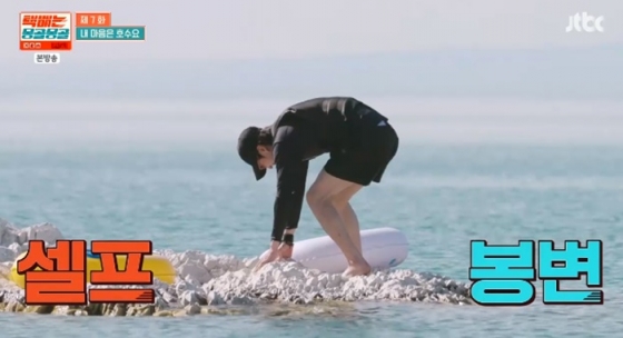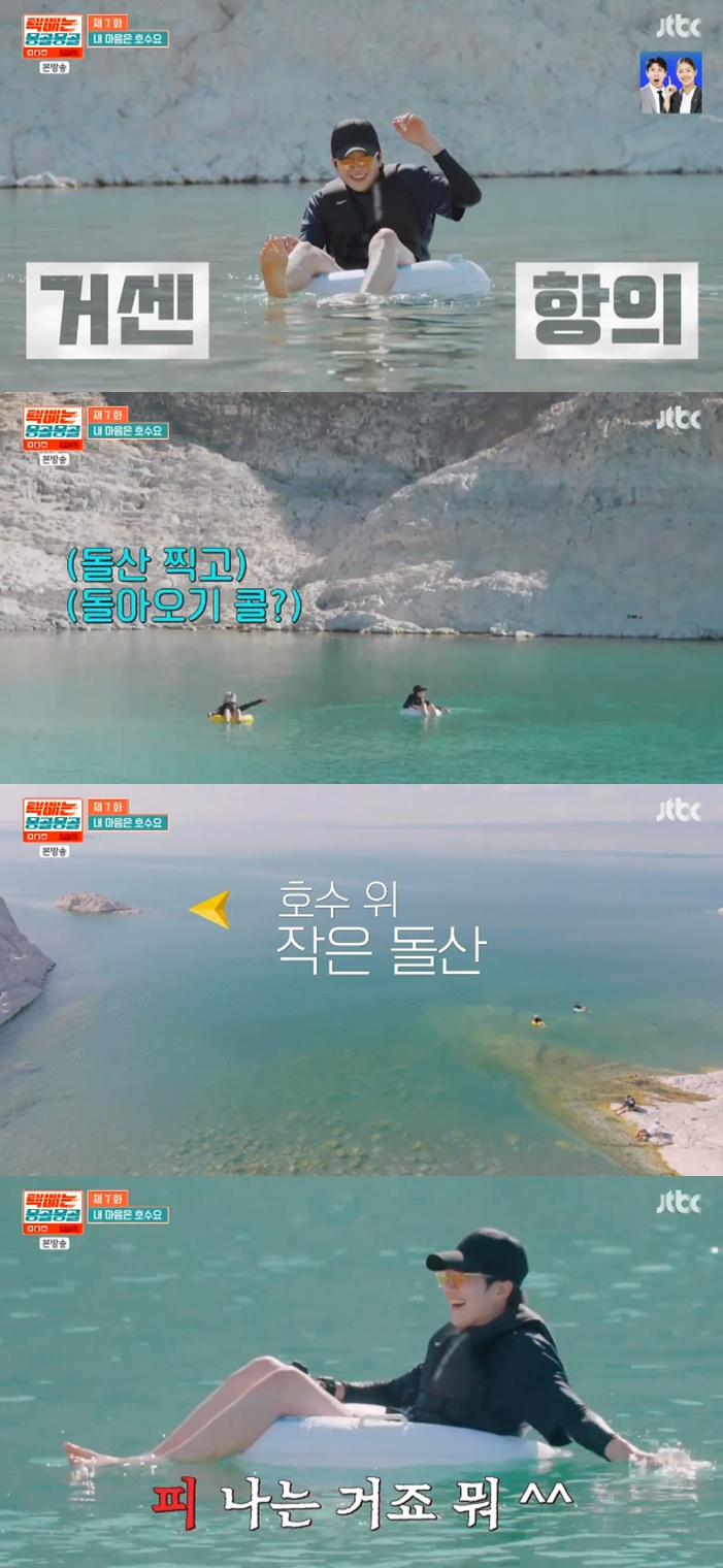 강훈과 차태현은 호수에 직접 들어가 튜브를 타고 경치를 구경했다. 그러던 중 차태현은 강훈에 "우리 저 돌산 찍고 돌아오자"며 내기를 제안했다.