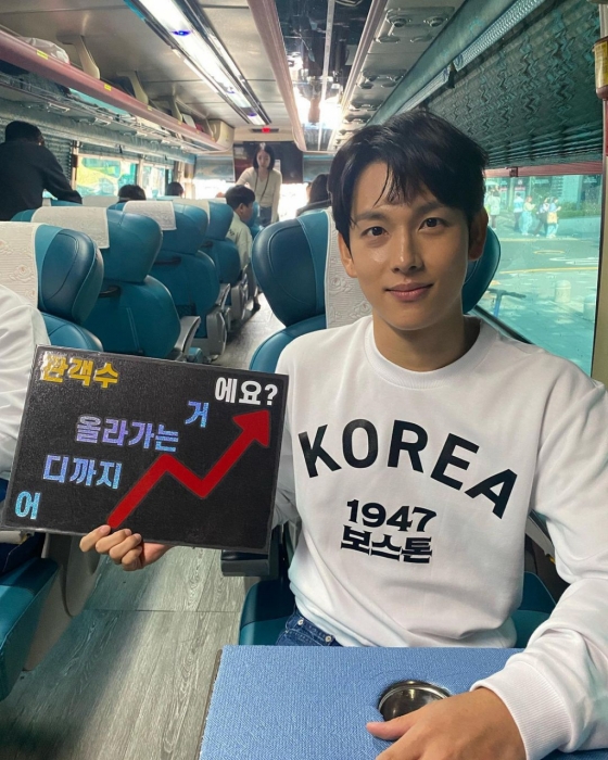 사진 속 임시완은 영화 '1947 보스톤' 홍보차 무대 인사를 하기 위해 버스로 이동 중인 모습. 그는 상승 곡선 그래프가 그려진 플래카드를 손에 든 채 미소를 머금고 있다.