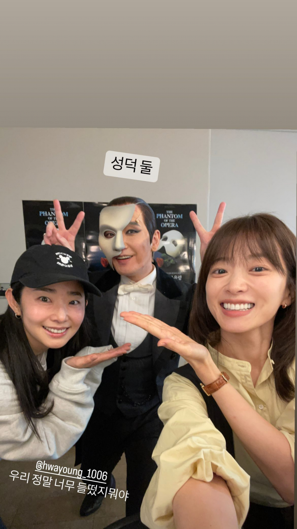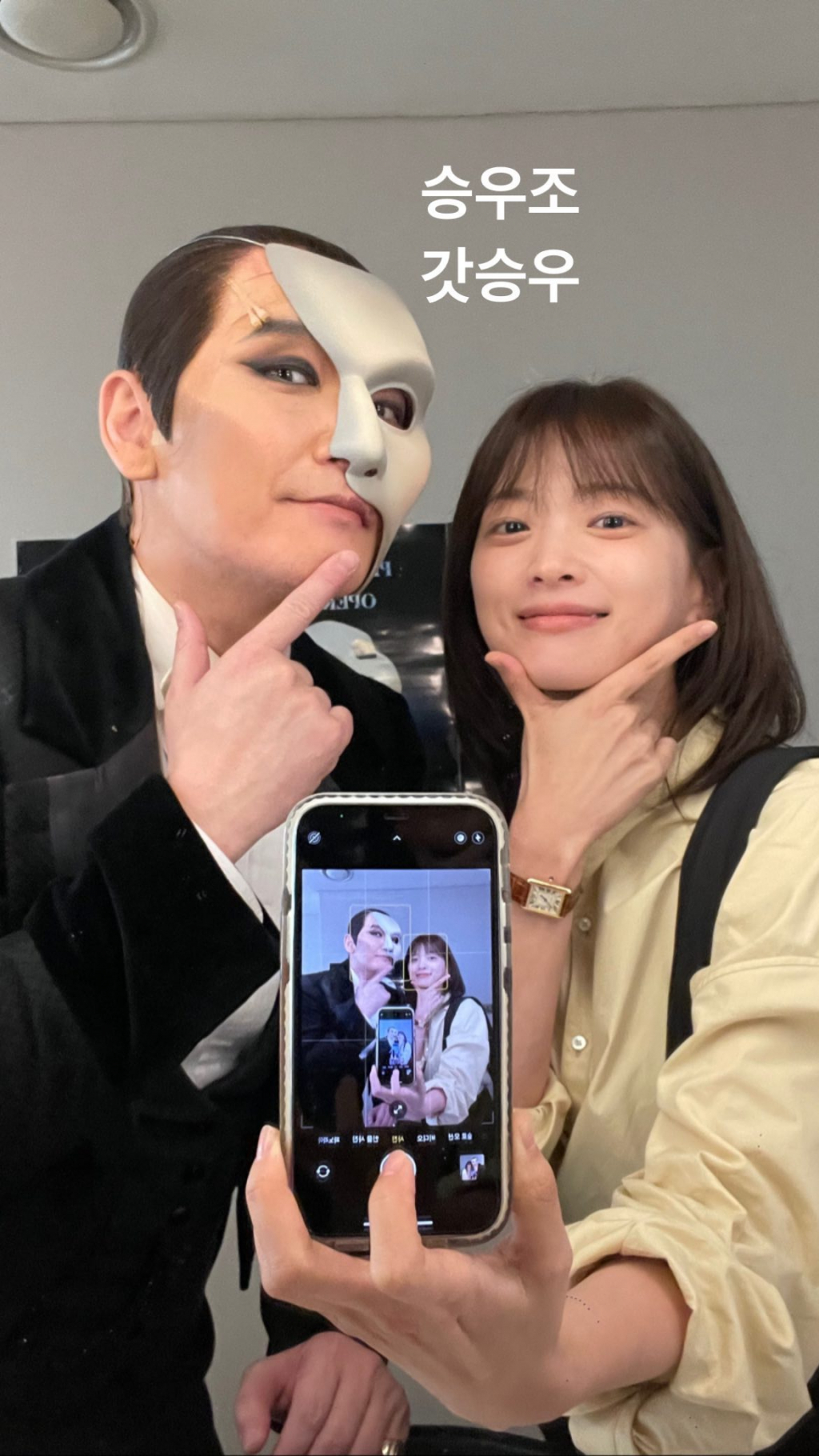 사진 속 천우희는 뮤지컬 '오페라의 유령' 무대에 오르고 있는 조승우 회차를 관람한 모습. 두 사람은 대기실에서 거울을 바라보며 MZ식 셀카를 촬영하며 훈훈한 분위기를 자아냈다.