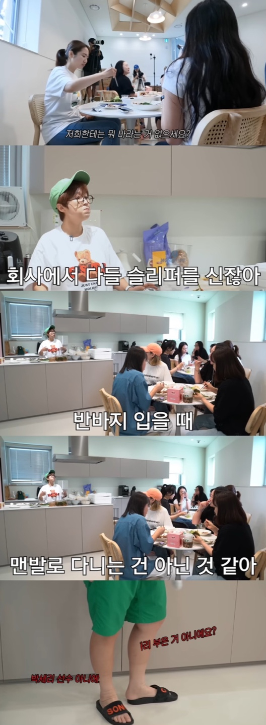 송은이가 특별히 준비한 점심 특식에 감동받은 직원들은 "대표님 맨날 저희 이렇게 챙겨주는데 저희한테 바라는 거 없냐"라고 물었고, 송은이는 "나 있다"라며 "회사에서 다들 반바지를 입고 슬리퍼 신잖아. 그런데 맨발로 다니는 건 아닌 것 같다"라며 마음에 담아두고 있던 불만 사항에 대해 솔직히 털어놨다.