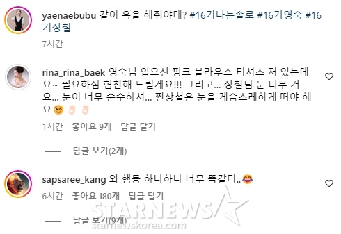 이에 16기 영숙과 상철이 게시물 댓글에 함께 등장해 네티즌들의 시선을 사로잡았다. 영숙은 "영숙님 입으신 핑크 블라우스 티셔츠 저 있는데요~ 필요하심 협찬해 드릴게요!!! 그리고... 상철님 눈 너무 커요... 눈이 너무 순수하셔... 찐상철은 눈을 게슴츠레하게 떠야 해요"라고 댓글을 달고 웃음을 자아냈다. 상철은 "와 행동 하나하나 너무 똑같다"라고 댓글을 달며 신기해했다.