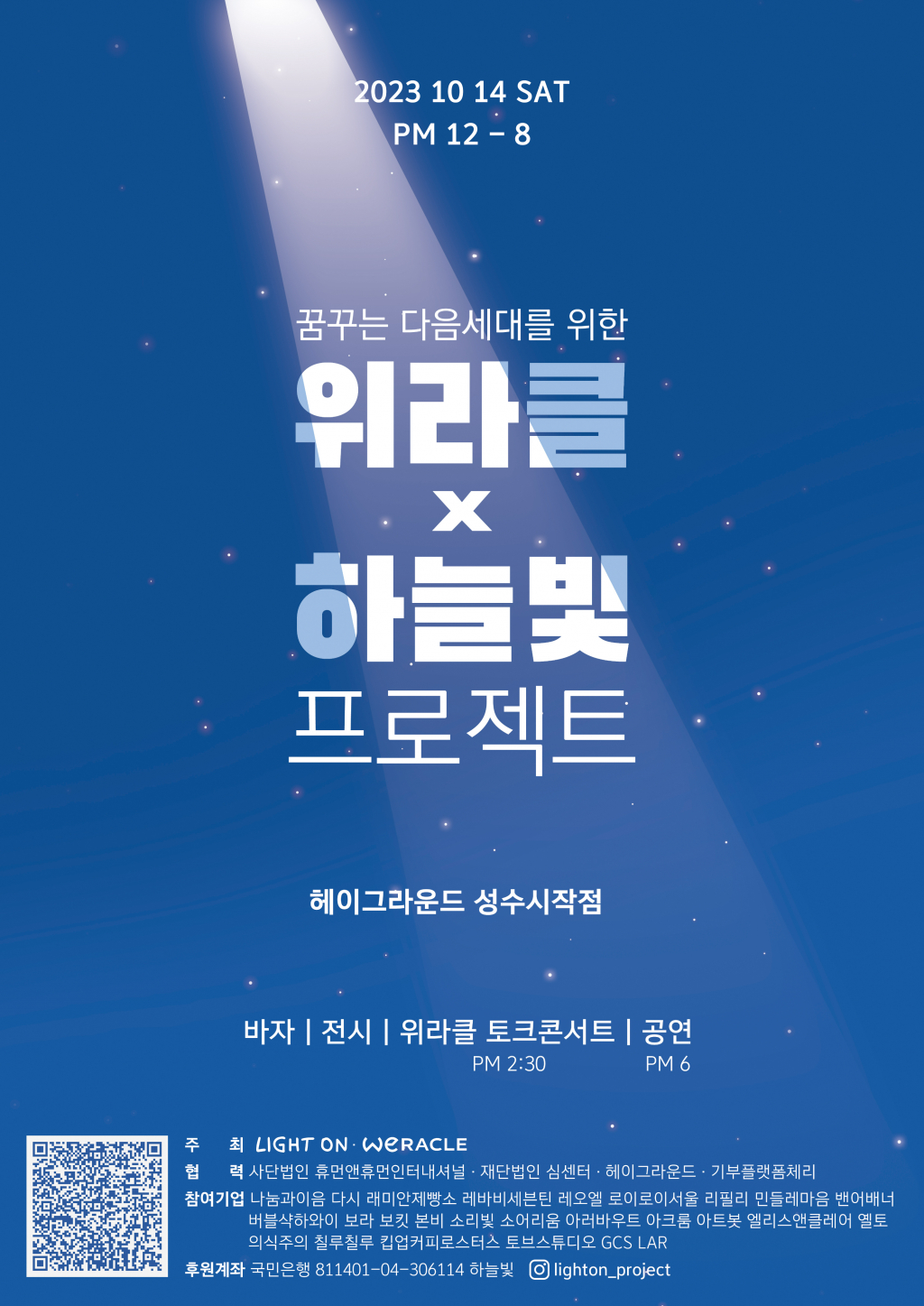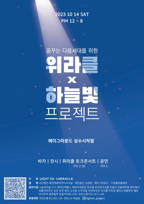 어둠 속 빛을 밝히는 착한 나눔 '위라클 X 하늘빛 프로젝트'가 10월 14일 토요일 낮 12시부터 오후 8시까지 헤이그라운드 성수시작점에서 열린다. 매년 풍성한 공연과 전시, 바자회로 기부 참가자들에게도 기쁨을 선사했던 이들은 올해 더욱 막강한 라인업을 준비했다.