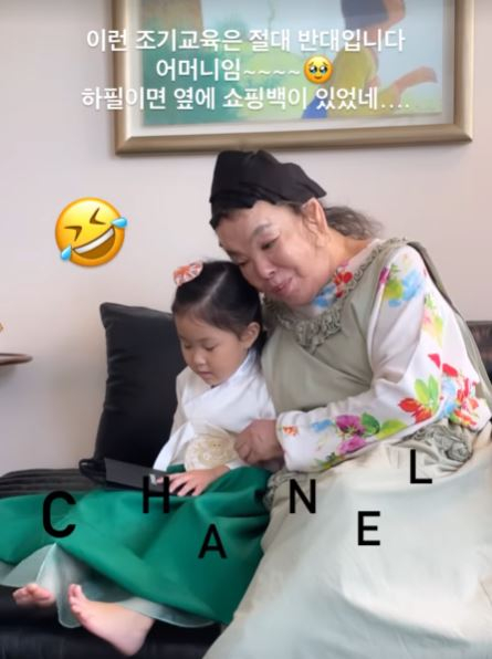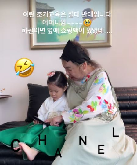 공개된 영상에서 김수미는 명품 브랜드인 샤넬 쇼핑백을 손에 든 손녀에게 영어 철자를 하나씩 읊으며 브랜드명을 알려주고 있다.