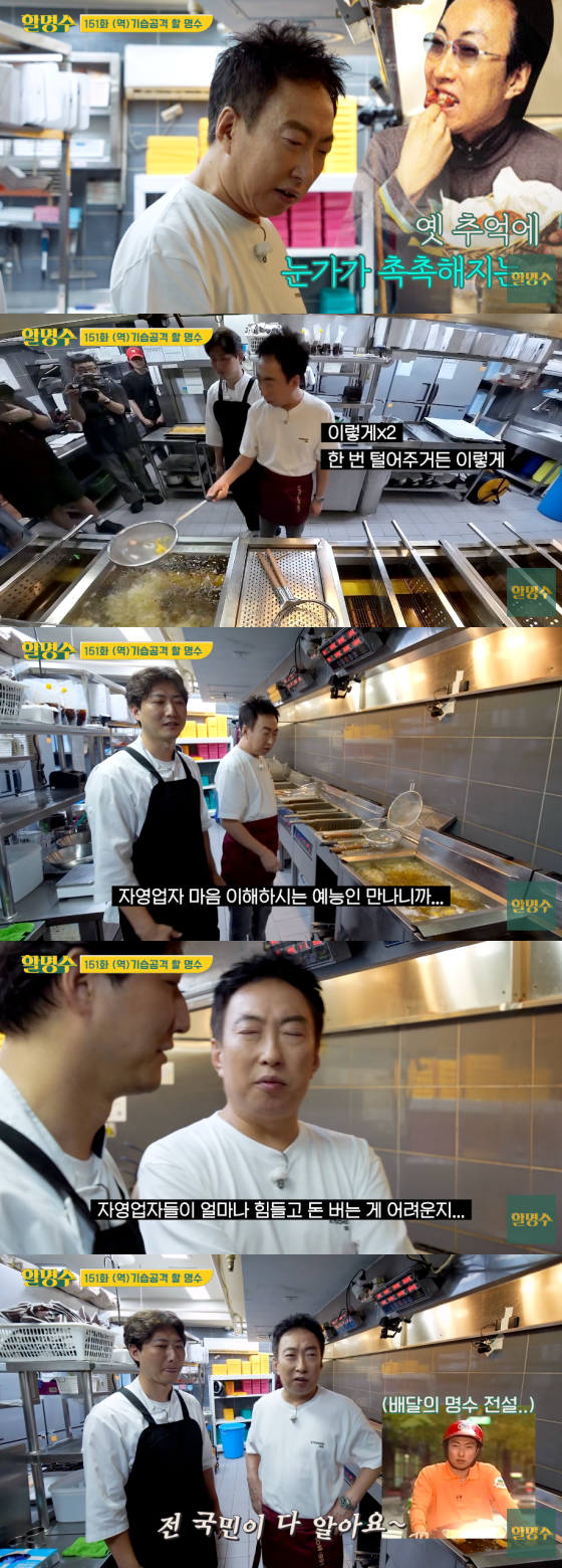 두 사람은 이후 주방으로 향했다. 박명수는 튀김기 앞에 서자 "옛날에 진짜 많이 했다. 옛날 생각 난다. 눈물 난다"며 다시금 뭉클해했다. 왕병호는 이에 "자영업자 마음 이해하시는 예능인 만나니 (좋다)"며 기뻐했다.
