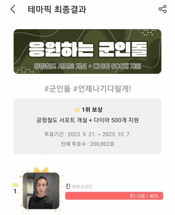 진은 최애돌에서 9월 21일부터 10월 7일까지 진행한 테마픽 '응원하는 군인돌' 주제로 진행된 투표에서 총투표수 20만 802표 중 8만 1168표(40%)를 얻으며 1위에 올랐다.