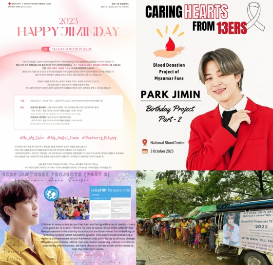 '지민네이션(JIMINATION_ASOC)'은 ''아이들이 깨끗한 공기를 마실 수 있도록 지원하기 위해 지민의 이름으로 베트남 유니세프에 기부했다''고 알렸으며 그외 또 다른 팬들은 지민의 이름으로 한국 소아암 재단에 기부하는가 하면, 장애가족의 새로운 시작을 응원하기 위한 기부 하이킹 프로젝트도 진행된다.