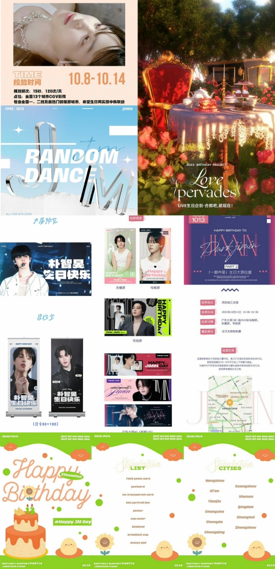 그동안 '지민바 차이나'는 아이돌 최초 비행기 외부 래핑 광고를 비롯해, 강남 한복판에서의 '눈 내리는 10월' 프로젝트 등 획기적이고 참신한 아이디어와 역대급 서포트를 선보여왔다. 올해도 21가지에 달하는 다양한 이벤트로 지민의 생일을 축하하며 특별한 애정을 표현하고 있다.
