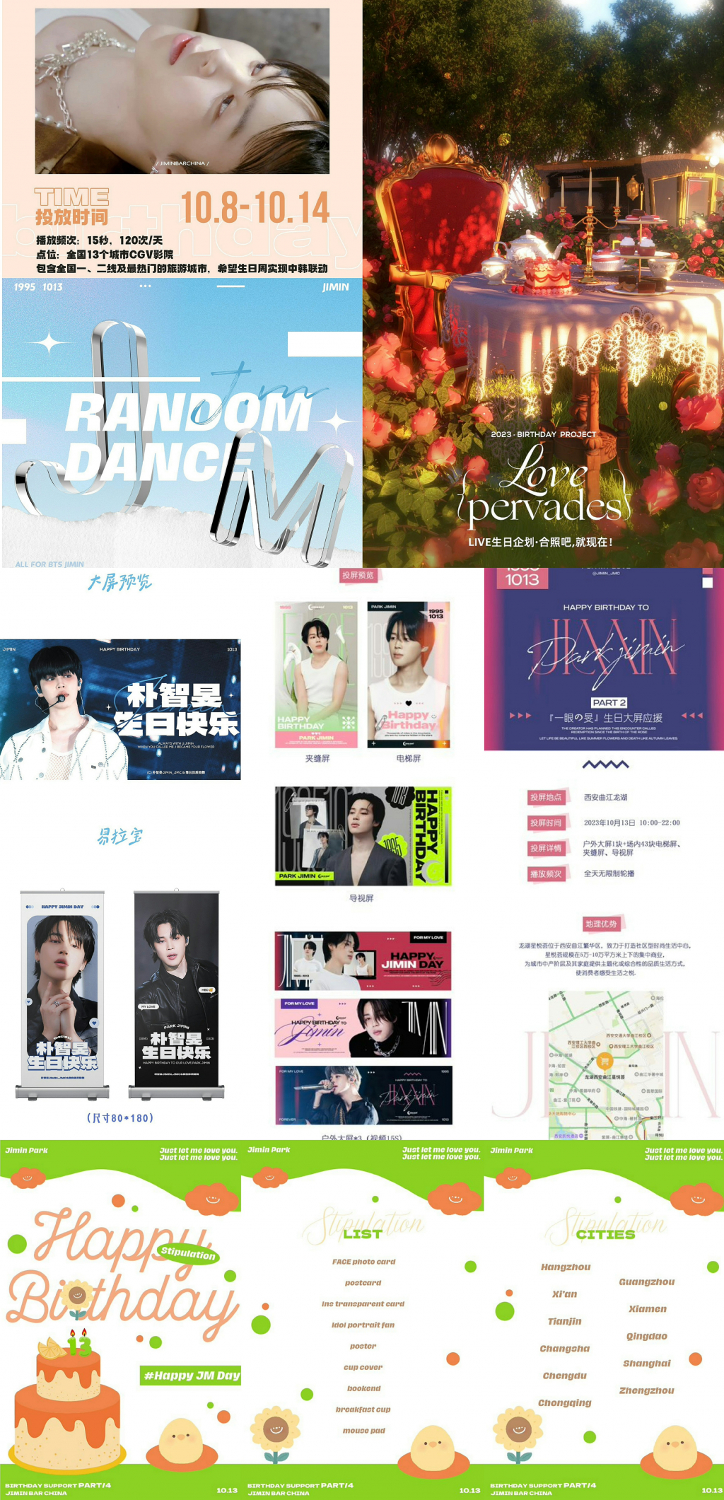 베이징, 상하이 등을 포함한 13개 도시 CGV에서는 10월 8일부터 14일까지 하루 총 120회 지민의 생일 기념 영상 광고가 송출되며, 10월 8일부터 22일까지 중국 53개 도시에서 오프라인 포토 부스를 운영한다.