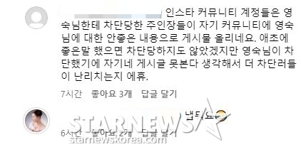 또 다른 팬은 "사람들이 착각하는게, 고소'했다'가 아니고 '들어가겠습니다'라고 썼던데.. 이건 아직 고소 안했단거 아시죠? 대형펌은 기업간의 일을 보통 다루지 이런 일개 명예훼손급도 아닌 지인뒷담화 몇번 한 자잘한 사건을 다루지도 않을뿐더러, 수임료가 몇백이 아닌 수천만원부터인데 반클립 짝퉁 쥬얼리에 찻잔세트 모두 짝퉁만 쓰는 옥순님이 수천만원을 내면서 고소를 하겠다...?ㅋ 못해요 걱정마요ㅋ 대신 본인 이름 알리고싶어서 옥순한테 무료로 해준다는 변호사는 있을수 있음"이라며 영숙을 두둔했고 다른 팬도 "인스타 커뮤니티 계정들은 영숙님한테 차단당한 주인장들이 자기 커뮤니티에 영숙님에 대한 안좋은 내용으로 게시물 올리네요. 애초에 좋은말 했으면 차단당하지도 않았겠지만 영숙님이 차단했기에 자기네 게시글 못본다 생각해서 더 차단러들이 난리치는지 에휴"라고 밝혔다.