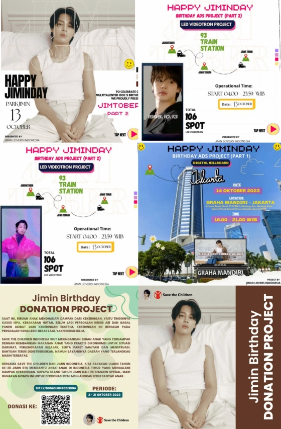 인도네시아 팬베이스 'Jimin Indonesia'(이하 PJM_INA)는 지민의 생일 당일인 13일과 14일 이틀간 자카르타를 비롯한 인도네시아 13개 도시에서 94개의 LED 스크린을 통해 지민의 생일을 대대적으로 축하한다.